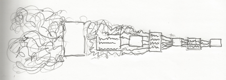 Entlang eines ersten kurzen Texts („erste Gedanken“) von Marlene Streeruwitz wurde die Gesamtform in zehn Teilen entworfen. Diese kennzeichnen sich durch unterschiedliche innere und äußere Räume – was nicht mehr ausgesprochen werden kann übernimmt die Musik. Ein Teil, in dem es um den Übergang von „Stimmen hören“ in „Musik hören“ geht, mag dafür exemplarisch genannt werden.